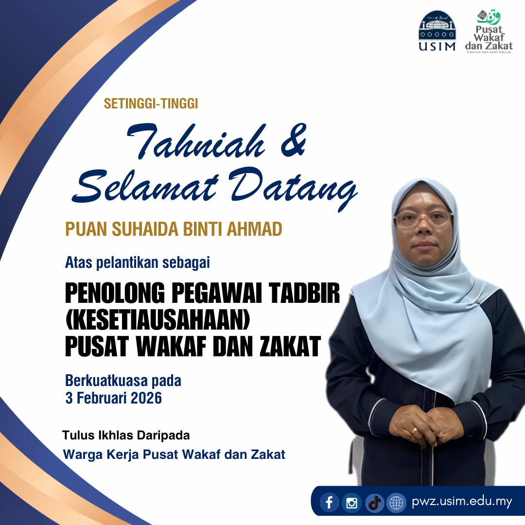 Warga kerja Pusat Wakaf dan Zakat (PWZ) Universiti Sains Islam Malaysia (USIM) merakamkan setinggi-tinggi tahniah dan selamat datang kepada Puan Suhaida binti Ahmad atas pelantikan sebagai Penolong Pegawai Tadbir (Kesetiausahaan) yang berkuat kuasa mulai 3 Februari 2026.
